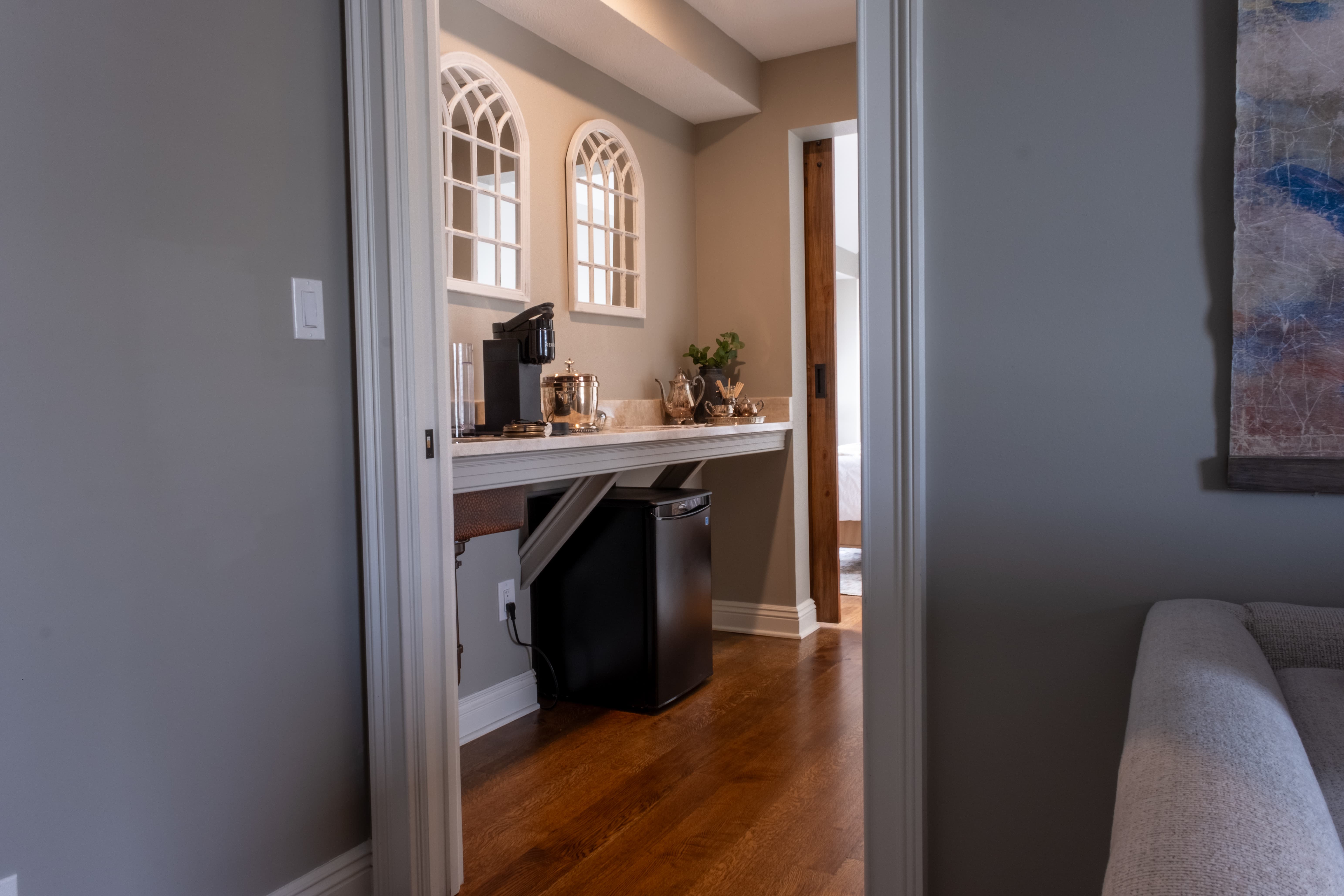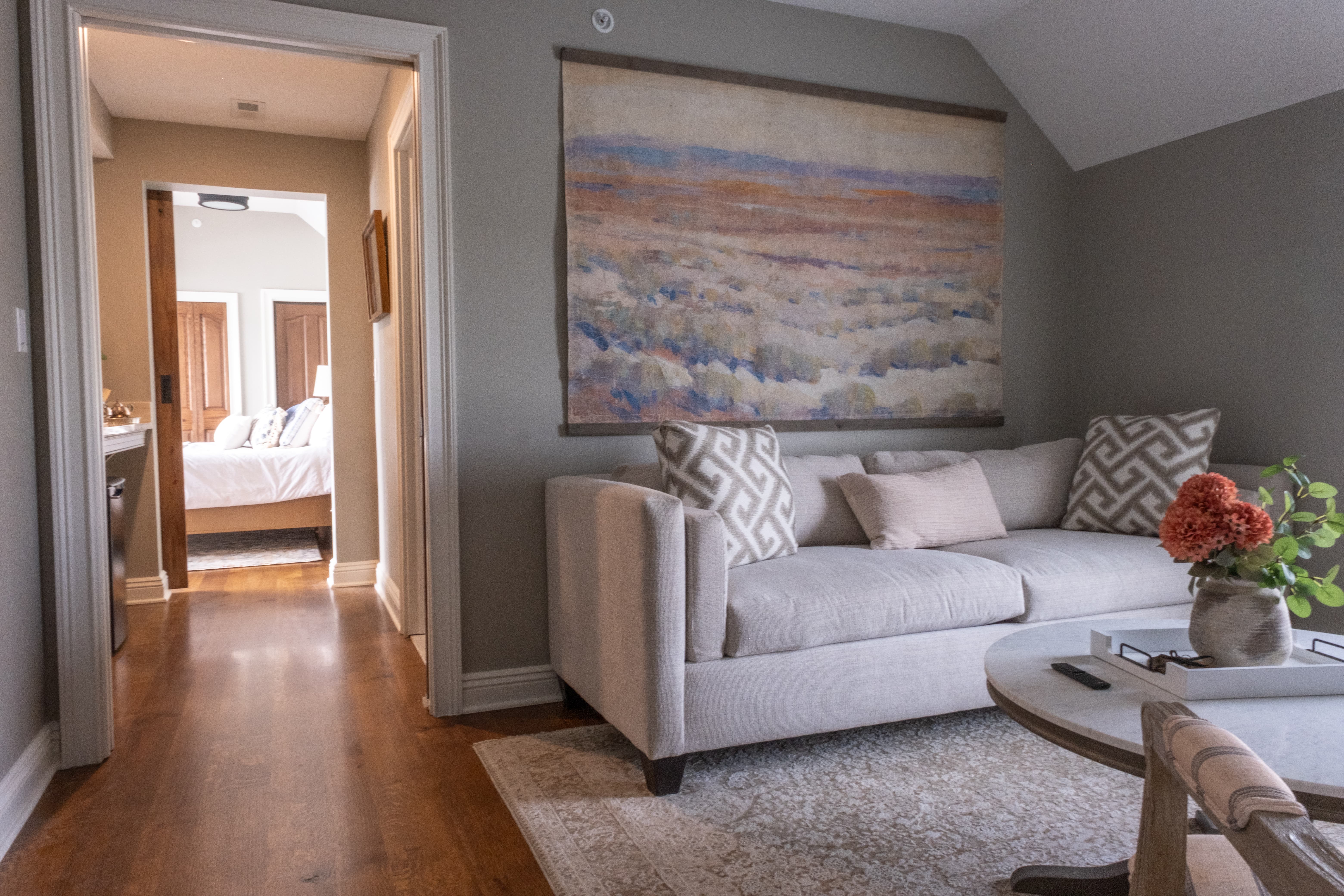 Relax in the Two Room Lakefront Suite, where serenity meets luxury. Enjoy unobstructed views of Lake Erie from the comfort of a plush king-size bed. The light-filled lounge area features a chic wet bar and tasteful furnishings, perfect for unwinding with a selection of fine wines. The well lit bathroom and elegant living space adorned with curated art ensure a peaceful retreat. Embrace nature and sophistication in this serene ambiance.