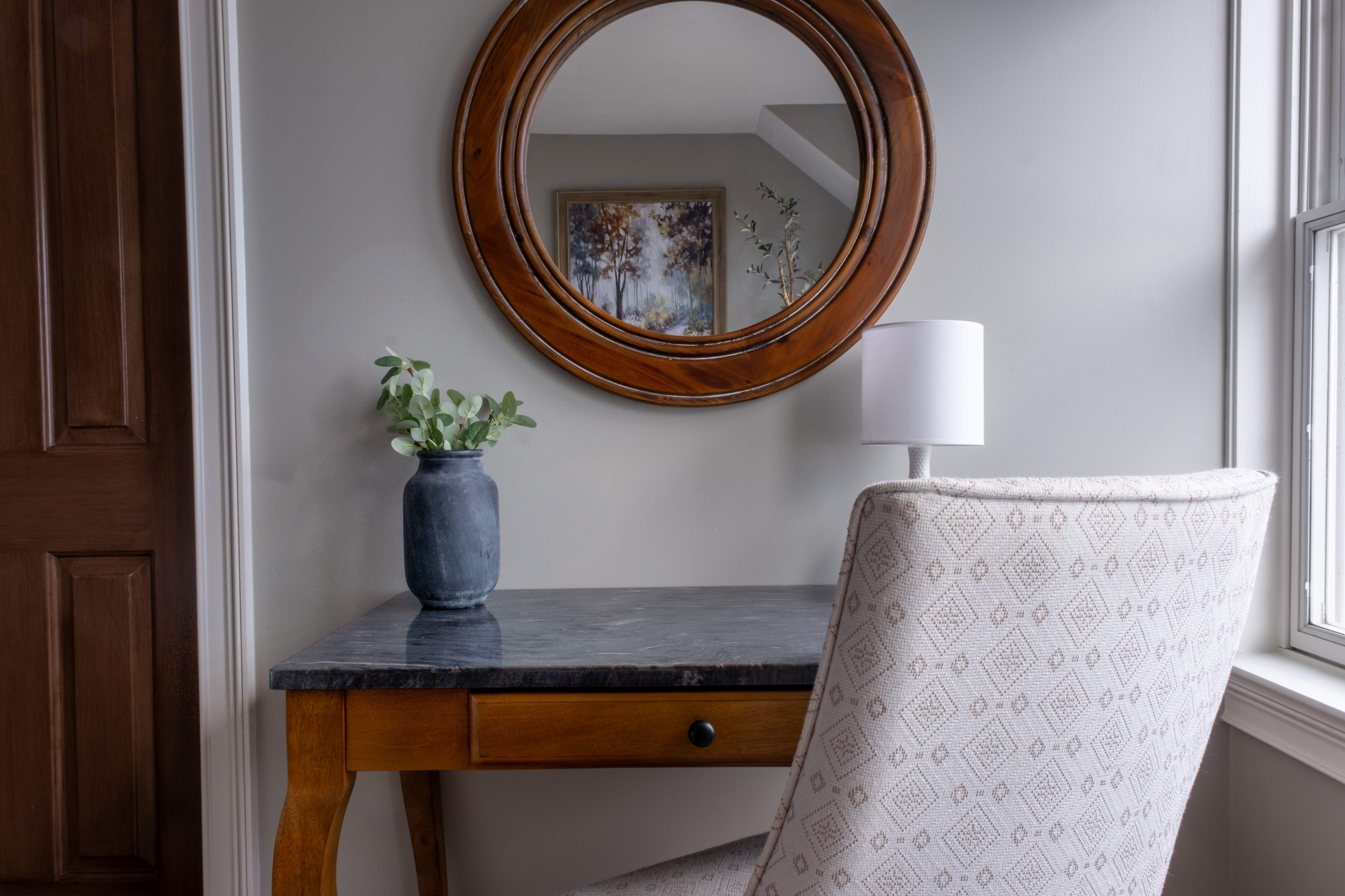 Large windows bathe the room in natural light. This room is ideal for relaxation and unwinding, featuring a desk and armchair for quiet reading and a flat-screen TV for entertainment.